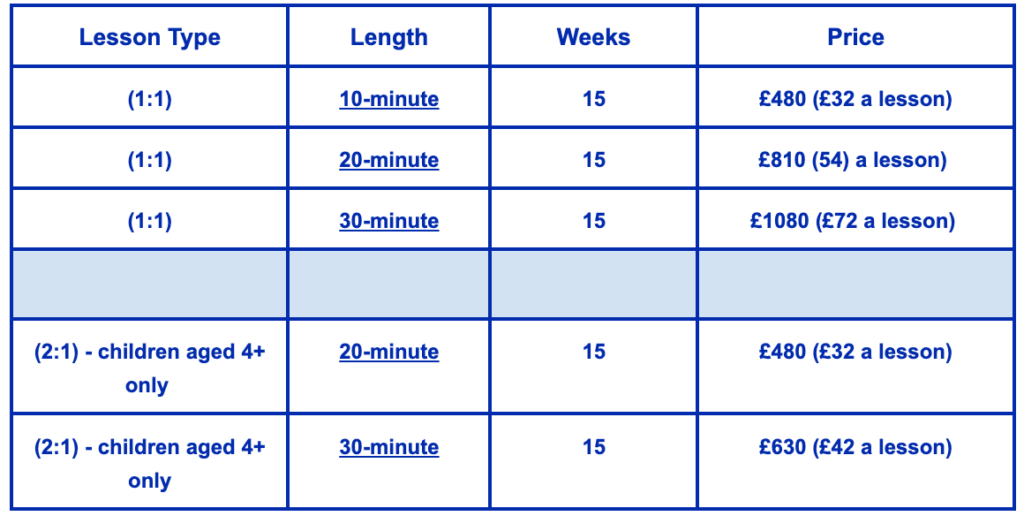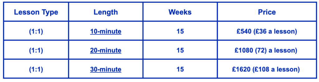 *Please note that all the lessons run as usual on bank holidays unless within school holidays. Where lessons are started after the term has begun, fees will be charged on a ‘pro-rata’ basis.
